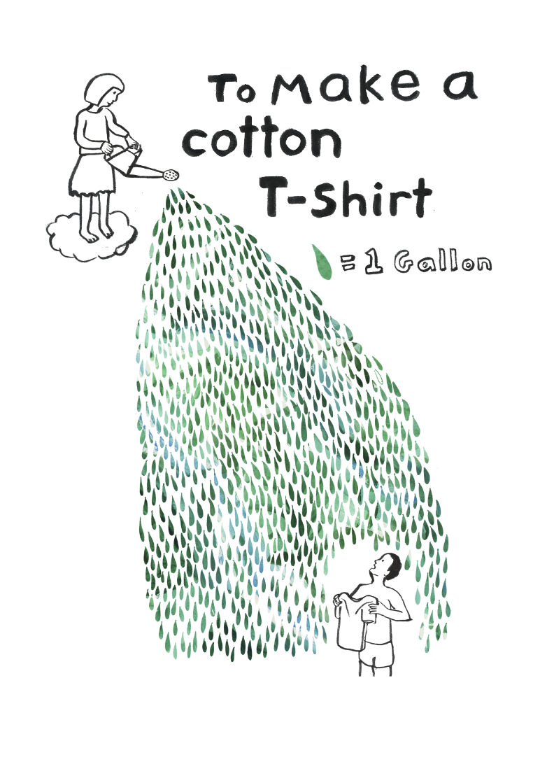 - More than 713 gallons of water go into the production of one cotton T-shirt.